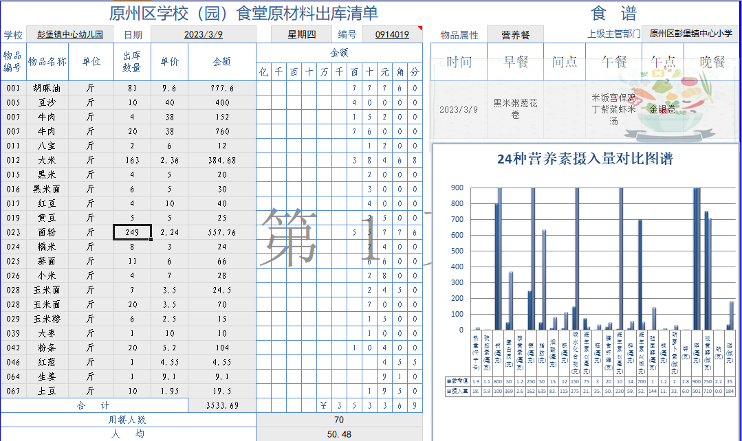 1.出库的同时完成记账、食谱和人均营养元素摄入计算,真所谓“一箭四雕”;一键选择库存物品列表,超库存录入警告提示,营养素人均摄入量瞬间计算,真正实现带量用餐。