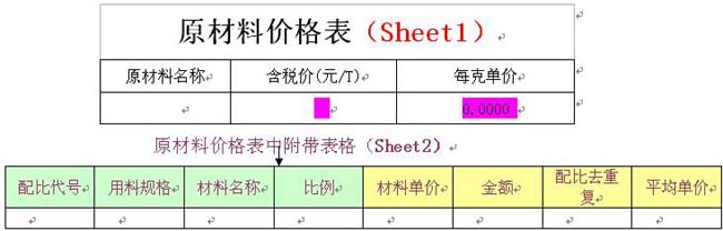 1、当原材料表中的含税价变动后通过表间公式自动保存到配方表,配方表中的数据再提取到原材料价格表Sheet2中,原材料价格表保存时再回写到贯流风叶成本汇总表每克单价。