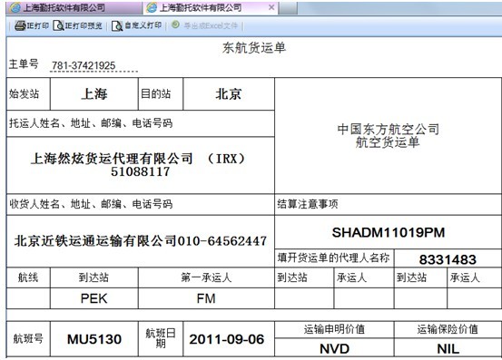系统可以实现航空主单、快递单、客户提货单等单据的套打: