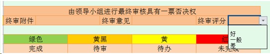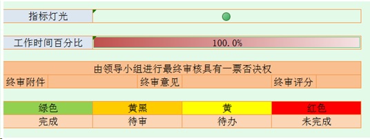 3、灯光指示功能。我们增加指示灯光,用来警示任务指标完成情况。(1)指标在节点日期内未填报,灯光显示黄色;(2)超过节点日期未填报或填报但是审核未通过,灯光显示红色;(3)被考评单位将该项指标填报完成,灯光自动变成黄黑色,代表等待审核状态提醒审核单位进行审核;当审核通过灯光显示绿色,表明此项指标完成。