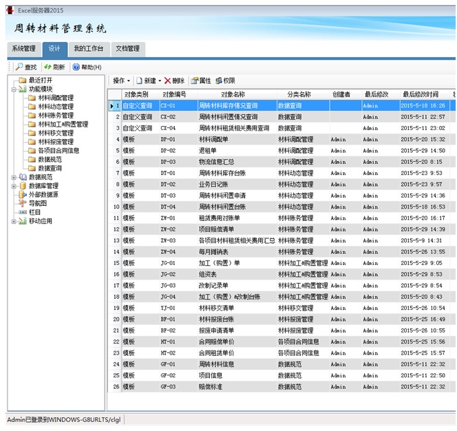 为解决上述问题,本人在勤哲刘老师的帮助下,在Excel服务器软件平台上搭建了“周转材料信息管理系统”,本系统具有如下功能模块: