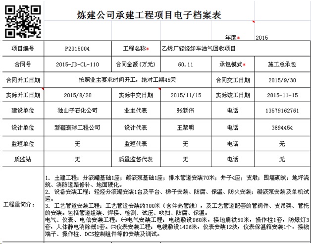 1、项目电子档案是自开工起至项目竣工后的动态管理和维护过程,中间需要《工程项目电子档案表》进行不断更新并传递到项目管理部、生产设备部、质量管理部,信息分散,传递过程费时费力,效率低。