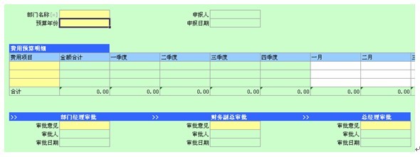如下图所示,用于在申报费用预算时,需填写本部门名称和预算年度。本模板中的费用项目字段为系统自动提取,数据来源于主数据中的“预算费用名称”模板。用户可以根据自己的需要增加新的费用项目,或者删除某些不需要的费用项目。费用预算的金额需要逐月填写,即从1月份到12月份,系统将自动计算每个季度的金额以及年度的总金额。