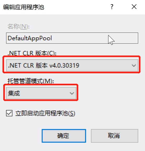16. .NET Framework版本选择v4.0.30319,托管管道模式选择“集成”