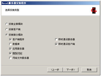 在数据库服务器上选择安装“数据库”、“网络文件服务器”和“即时通讯服务器”: