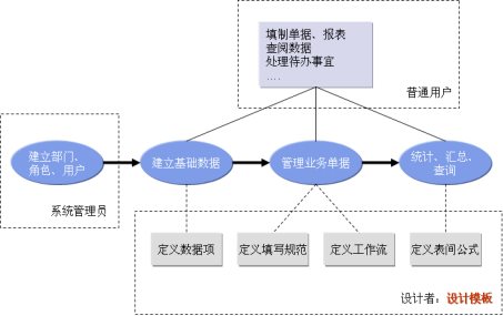上图表示了用Excel服务器建立信息系统的过程。中间四个椭圆形组成的主线表达了建立一个信息系统所要完成的四个方面:建立部门、角色、用户等基本信息;建立基础数据;管理业务单据;完成统计、汇总、查询。这些内容我们将在后续的章节中用实际的例子,由浅入深、由简单到复杂,逐步学会和精通。