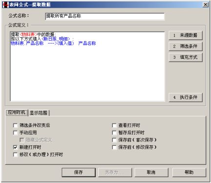 注意两处:1)应用方式我们选择了“新建打开时”,效果就是,当我们填报的时候,空白日报一打开,这条表间公式马上就执行。2)在显示方式处,我们选中了“重复数据只填充一次”。这是因为物料表中可能有这样的数据:名称相同,规格不同,所以如果全部提取出来会出现同样的品名重复显示好几行的情况,此选项用于保证重复的数据只显示一次。