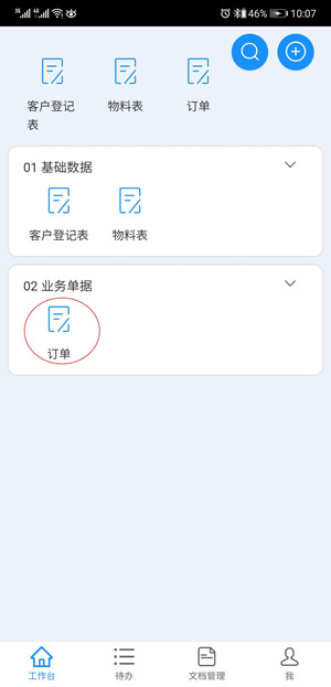 1.手机(APP)登录系统后,工作台点击订单图标。