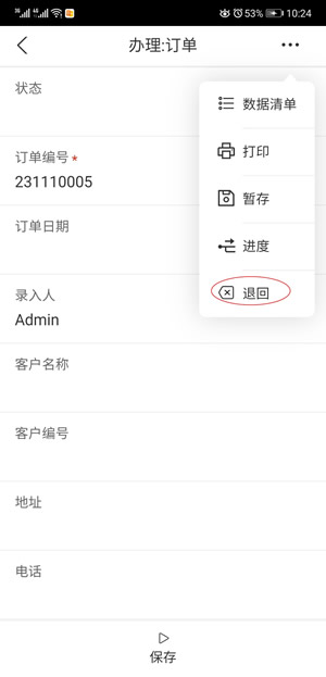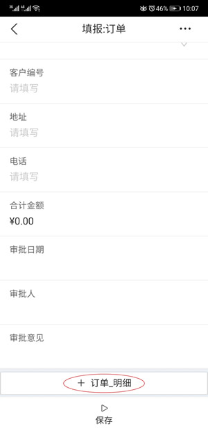 手机APP填报和办理工作流表单时可暂存表单,下面以订单的填报为例看一下如何操作暂存。办理时暂存将在15.7.3中讲解。