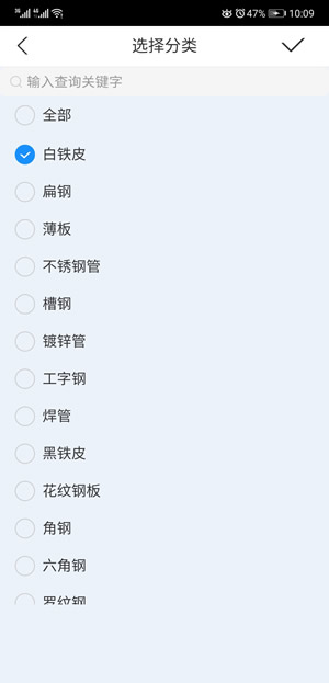 4.弹出列表选择页面,列表选择为分类显示时,则可通过选择分类后快速选择数据。完成选择后点击“√”。