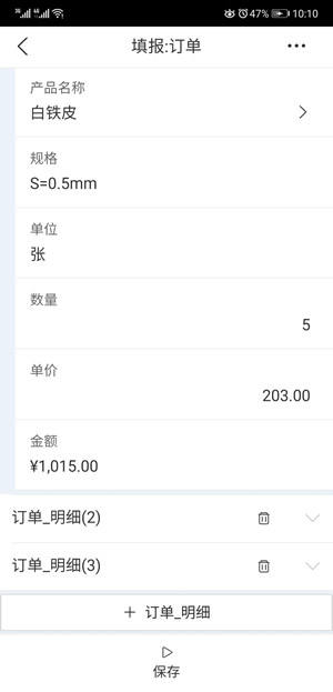 点击订单图标(默认视图为“数据清单”),显示订单数据清单页面,点击“+”则打开如上图的填报页面。