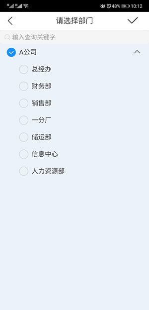 指定范围内用户若多于9人:显示部门分类,选择部门范围后显示对应的用户;