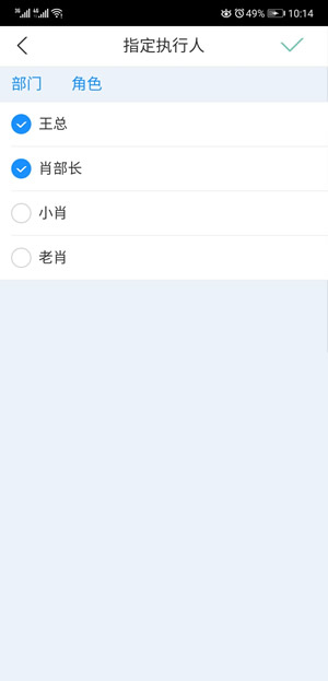 3.在图中选择部门则打开如下图所示页面,若用户仍较多,可点击【部门】或【角色】,缩小查找范围,来快速确定执行人。