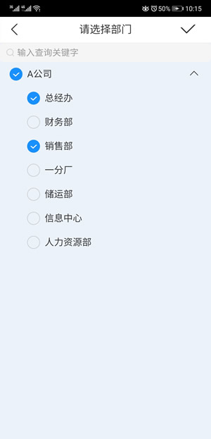 4.点击上图中【部门】链接,勾选下图所示两个部门,点击“√”。