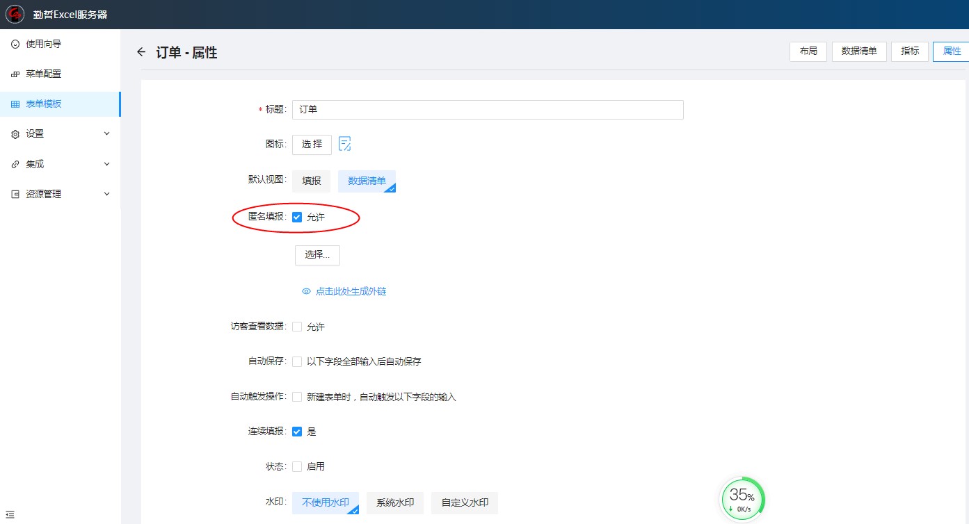 1.表单模板的【属性】页面,“匿名填报”勾选【允许】。