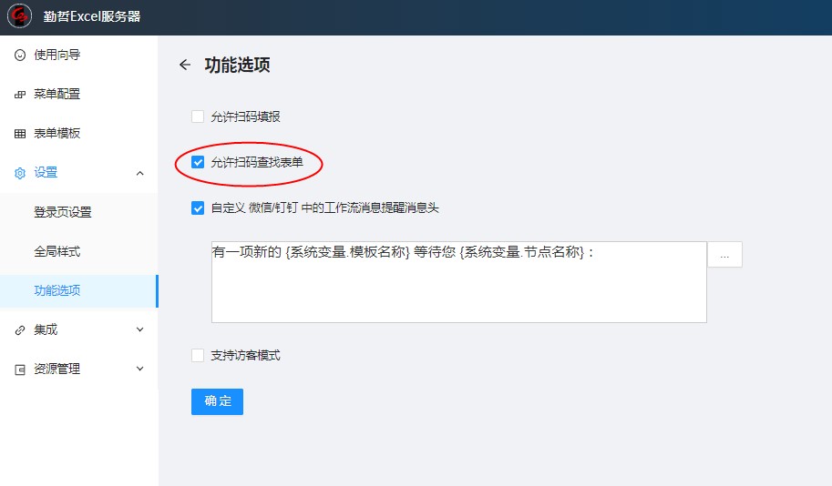 1.移动端设计页面中选中【设置】-【功能选项】,勾选“扫码查找表单”,【确定】。