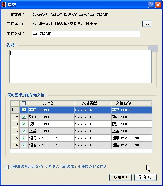 6.在窗口的下半部分,有一个“同时要添加的依赖文档”列表。所谓“依赖文档”,指当前文档所依赖的文档,假如文档A依赖文档B,则如果文档库B不存在,打开文档A会都是内容。什么情况下几个文档之间存在依赖关系,是由各个CAD软件自身的特性点决定的,一般而言,Pro/E的装配图,或Solidworks的装配图,因为由若干零件组成,所以,零件图就是装配图的依赖文档。当前的打开的CAD文档有没有、有哪些依赖文档,是由CAD软件自己识别的,用户不需要自行指定;当前文档的直接依赖文档,会列举在列表中,用户可勾选要把其中的哪些依赖文档一起提交到文档库。