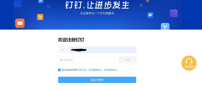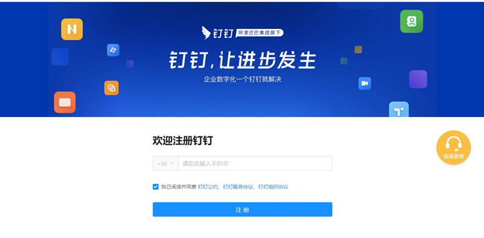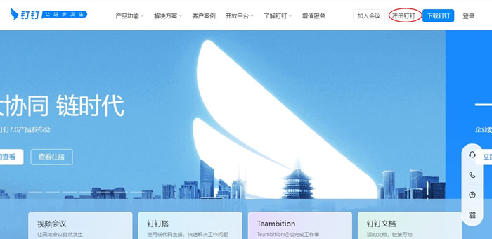 用浏览器访问 https://www.dingtalk.com/,点击【注册钉钉】。