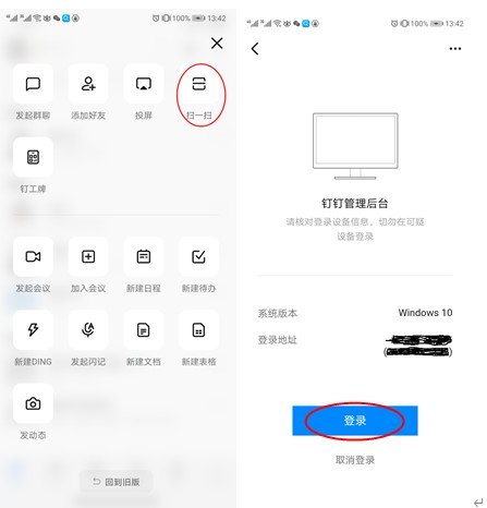 用钉钉移动端"扫一扫",扫描上图的二维码后点击【登录】。