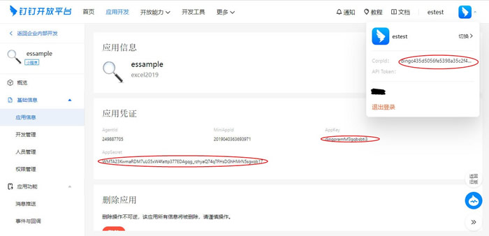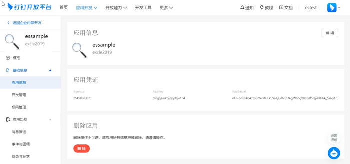 b. 点击【去开发】,打开如下页面,可复制“Corpid”、"AppKey"、“AppSecret”到ES服务器中钉钉的配置页面。