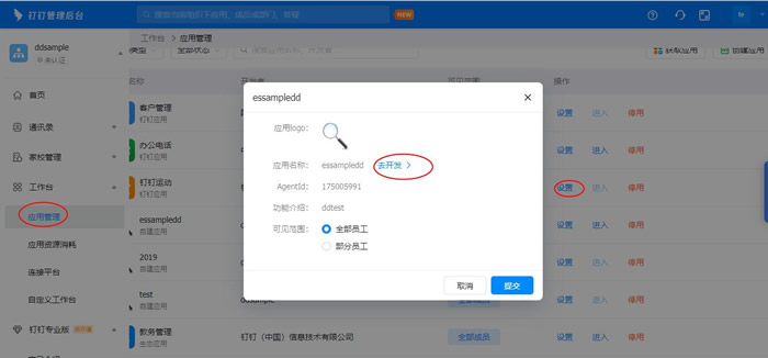 a. 登录钉钉管理后台页面,选中“工作台”-“应用管理”。点击对应的自建应用的“设置”链接。