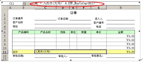 在我们的订单模板中,C1单元格是一个公式:=”人民币(大写”& ESF_mnyToCap(H11),如图。即,把H11处的订单合计金额转换成中文大写,前面加“人民币(大写)”字样。